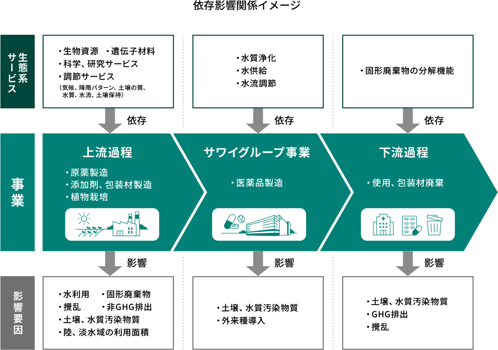 当社グループの医薬品製造や研究、販売などの事業および、医薬品製造における原材料調達段階(上流)、廃棄段階(下流)を対象として、自然との依存、影響関係を把握し、その結果特定した重要な自然との接点からリスク、機会を検討しました。 |