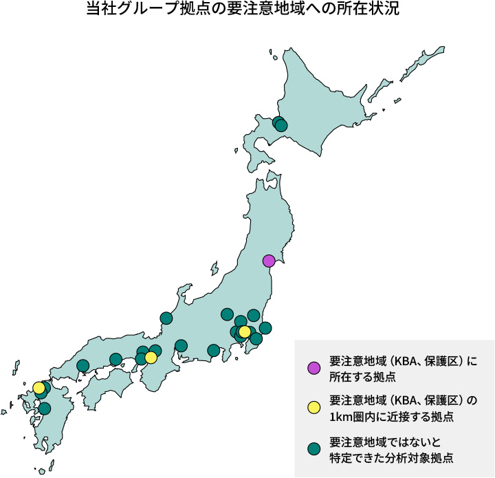 調査結果として、当社グループの保有拠点の中では、当社グループの仙台にある1つの支店が鳥獣保護区内に所在していることが判明しています。また、他にも東京、福岡の2つの支店、大阪の同じビル内に所在する支店、営業所が、保護区やKBA※に近接していると特定できています。これらの拠点は販売や製品管理といったオフィス業務が主であり、上下水道の利用以外に主だった自然資源の利用や、環境汚染物質の排出などの活動実態がないことから、自然との依存影響関係の程度は工場拠点と比べ低いことが想定されます。医薬品製造を担う工場拠点は要注意地域に該当する地域はありませんでした。