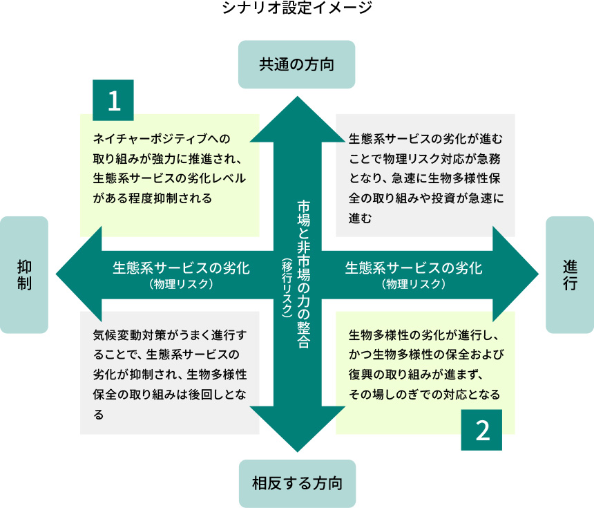生態系サービスの劣化レベルは、現在当社グループの事業において、自然環境の劣化による重大な損失が顕在化していないことから、深刻化せず抑制されていると考えられます。また、市場と非市場の力の整合については、当社グループが操業している日本や、拠点が所在する自治体、業界団体の自然環境保全の戦略立案等の取り組みが進んでいますが、消費者レベルにおける医薬品購入時の環境への意識はまだ高くなく、整合はやや低いと捉えています。これらの現状を踏まえて今回のシナリオ分析では、ネイチャーポジティブへの取り組みが強力に推進され、生態系サービスの劣化レベルがある程度抑制される想定と、想定以上に生物多様性の劣化が進行し、かつ生物多様性の保全および復興の取り組みが進まない想定の2種類の両極端なシナリオにおける考察を深堀することで、移行リスク、物理リスクの両側面で想定される最悪のケースに対しての、当社グループにおけるレジリエンス性の確認を行っています。